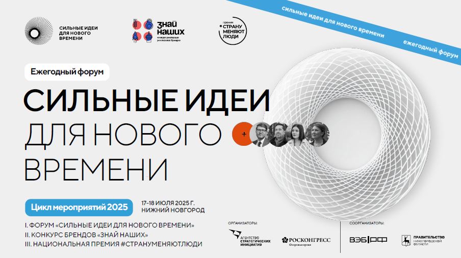 Открыт прием заявок на форум «Сильные идеи для нового времени».  Организаторы  –  автономная  некоммерческая  организация «Агентство стратегических инициатив по продвижению новых проектов» (далее – Агентство) и Фонд «Росконгресс», соорганизаторы – государственная корпорация развития «ВЭБ.РФ» и Правительство Нижегородской области. Свои идеи для позитивных изменений в стране можно подать на платформе идея.росконгресс.рф до 15 мая 2025 года. Затем эксперты отберут топ-100 идей. Самые сильные из идей будут представлены руководству страны в июле на финальном мероприятии в Нижнем Новгороде.