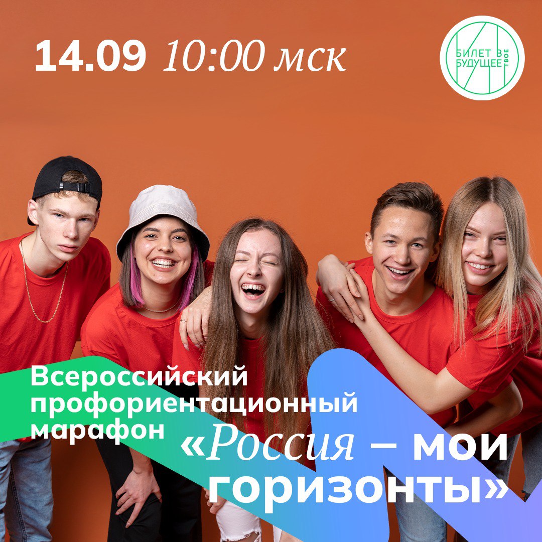 Главное событие осени для школьников и будущих абитуриентов, их родителей и педагогов – профориентационный марафон «Россия – мои горизонты». Мероприятие пройдет в офисе VK, в четверг, 14 сентября, с 10:00 до 15:00 по московскому времени. Для онлайн-участников будет доступна трансляция в сообществе «Билета в будущее» ВКонтакте.  Зрители из любого уголка страны получат возможность посмотреть всю программу: мероприятие пройдет в режиме онлайн в формате «открытого диалога».